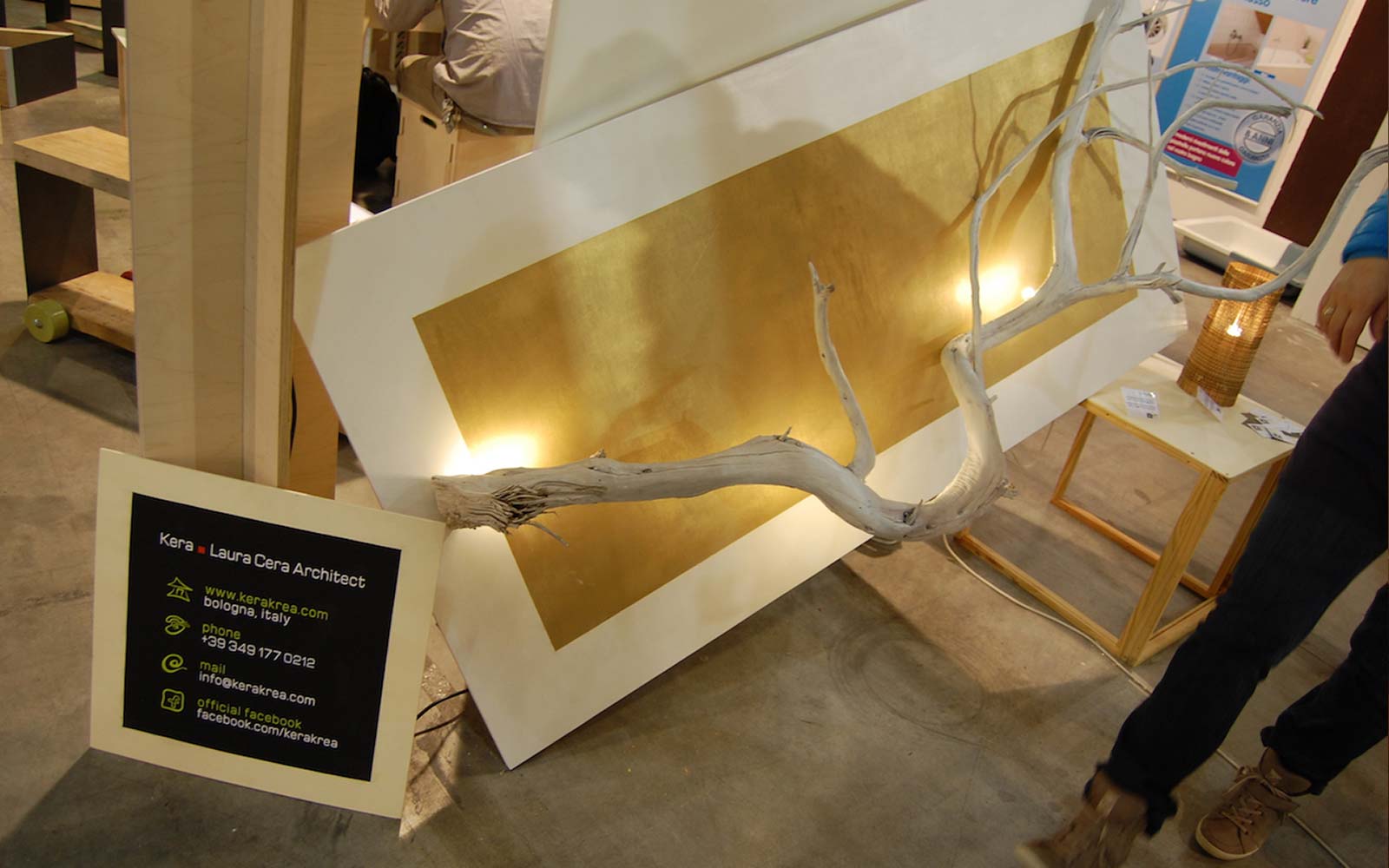 sul retro; come supporto, una superficie in legno bianca ai bordi e dorata al centro.