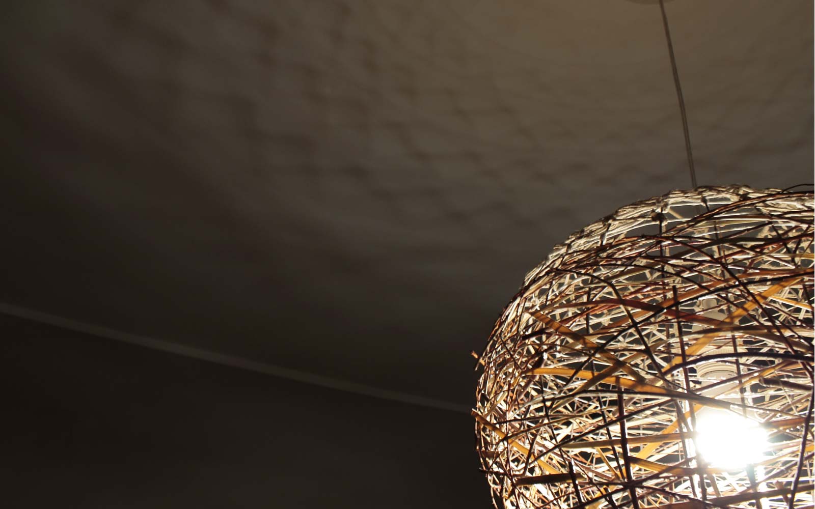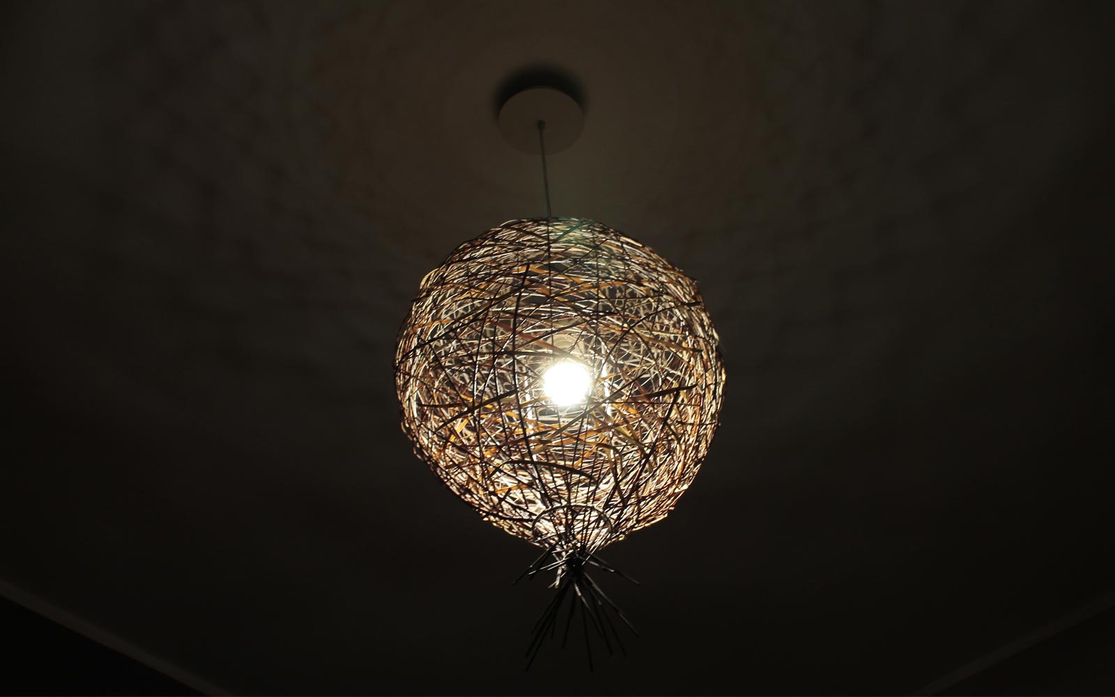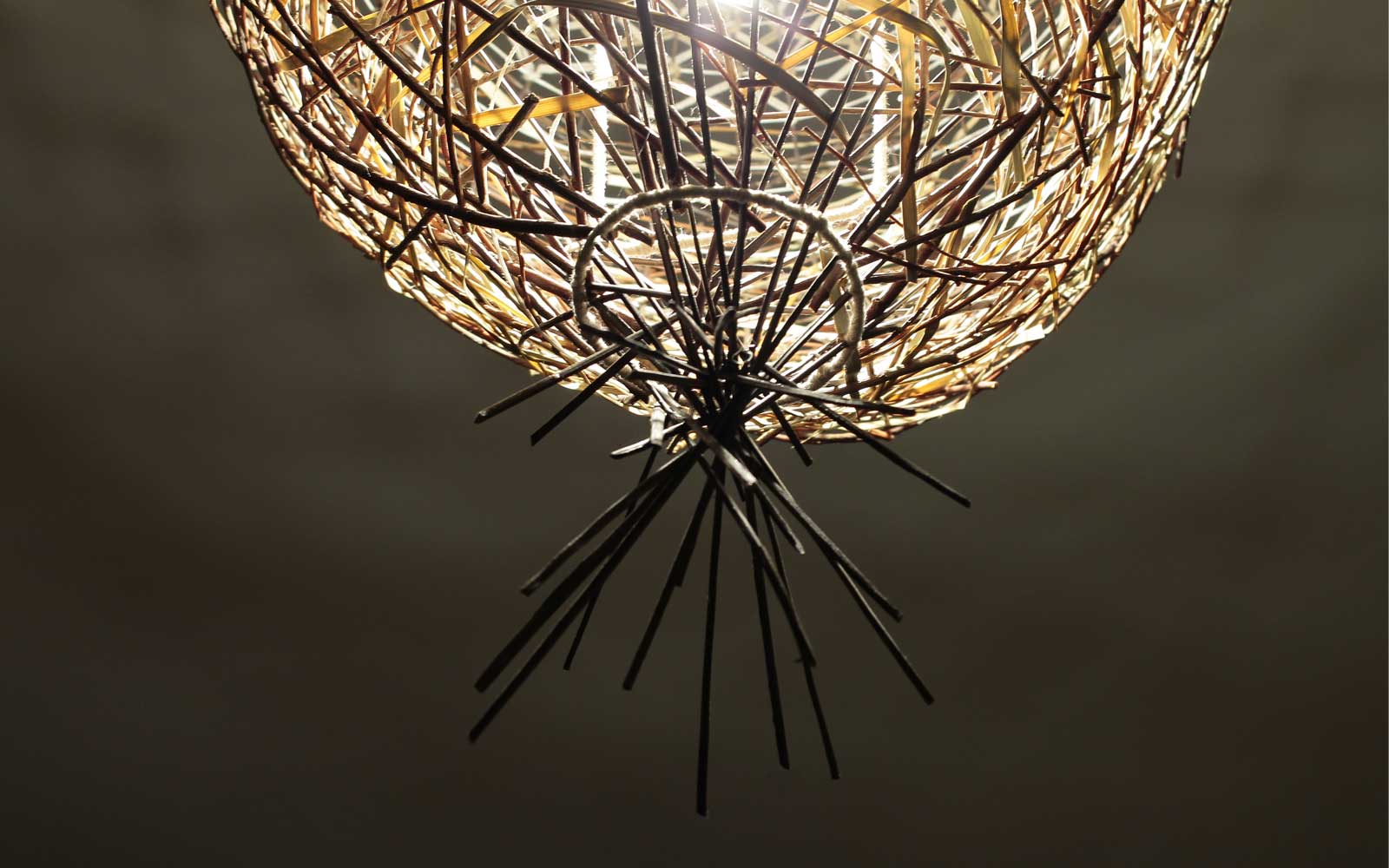 ORIMONO è una lampada a sospensione decorata con rami di salice e foglie di palma.